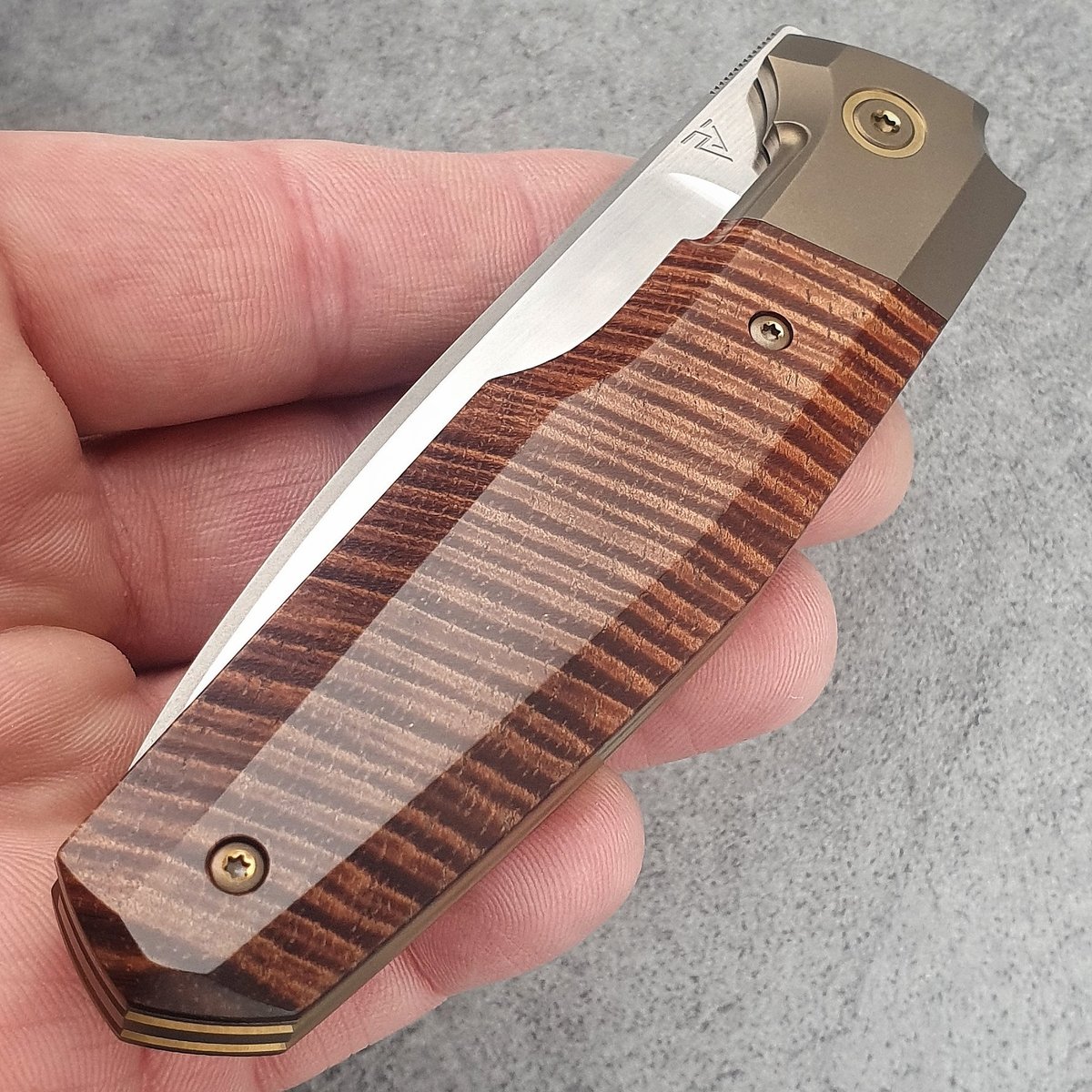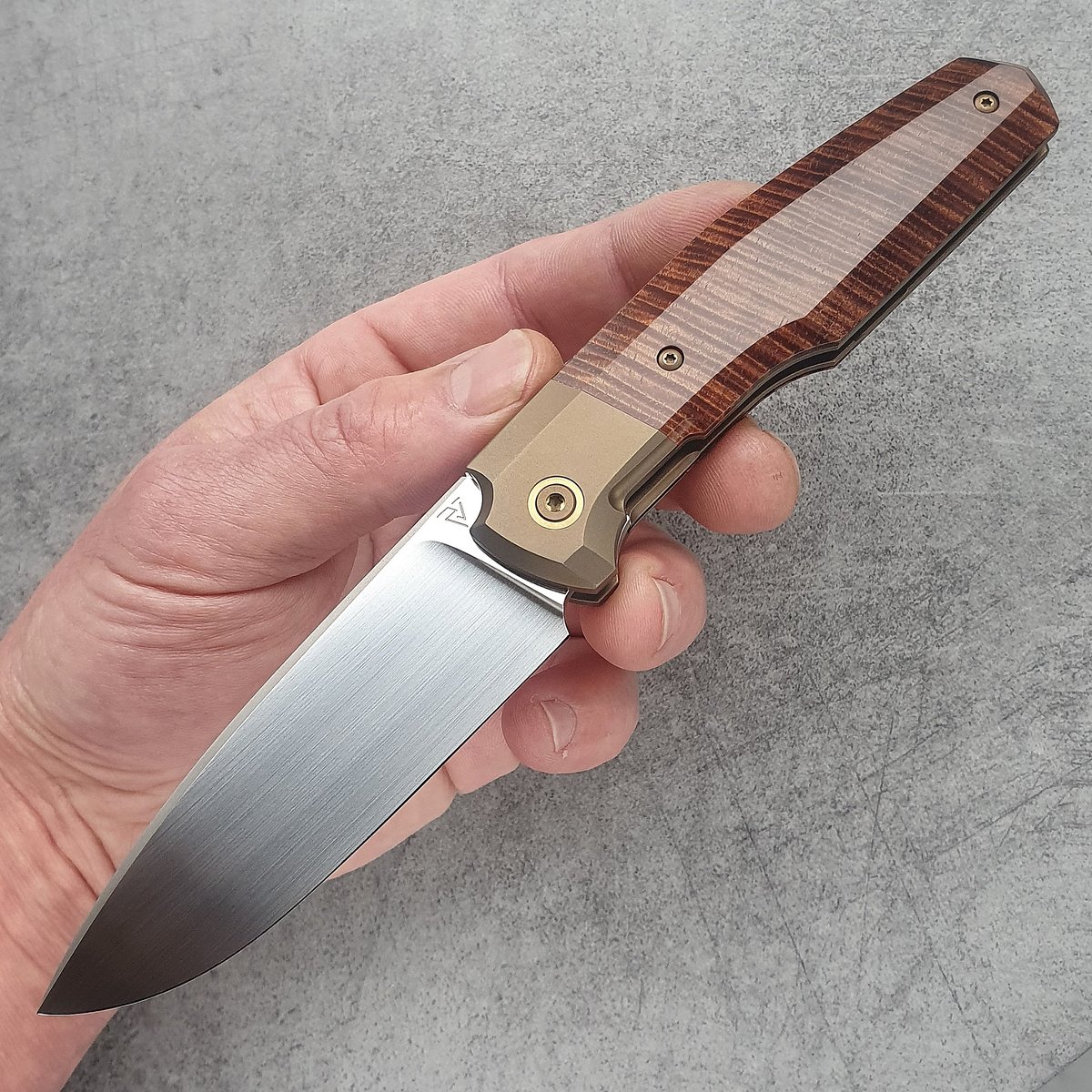 - CPM154CM hand rubbed blade run on CCBearing; bronze anodized titanium bolsters, spacer and clip; stabilsed Koa scales.
