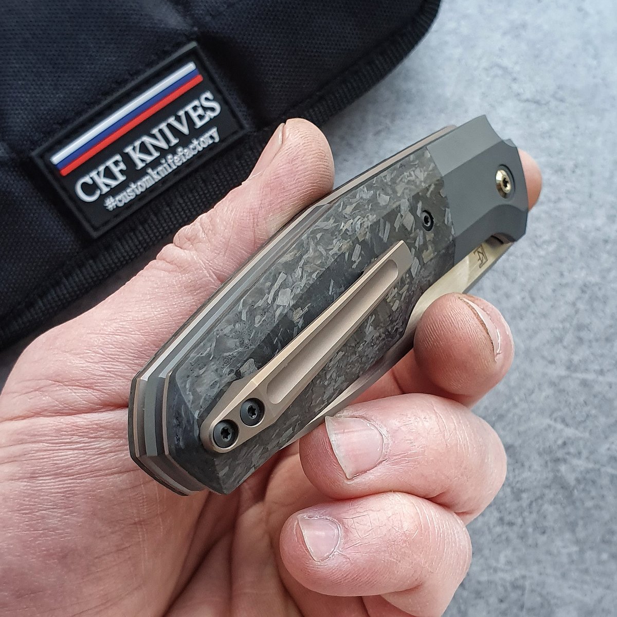 Fif20 in collaboration with the Russian firm "Custom Knife Factory". As usual, they did a great job! M 390 blade; titanium clip and plates; zirconium bolsters and spacer; marbled carbon fiber scales. All good ingredients for a successful recipe!