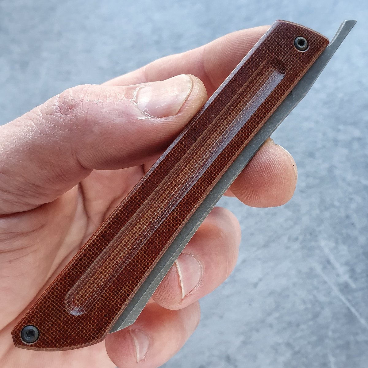 - RWL34 acid stonewash; titanium spacer; micarta scales.